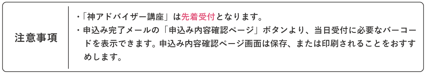 2)申込み後、事務局からの受付確認メールが迷惑メールフォルダに振り分けられてしまう場合があります。お手数ですが、迷惑メールフォルダを今一度ご確認をお願いいたします。
